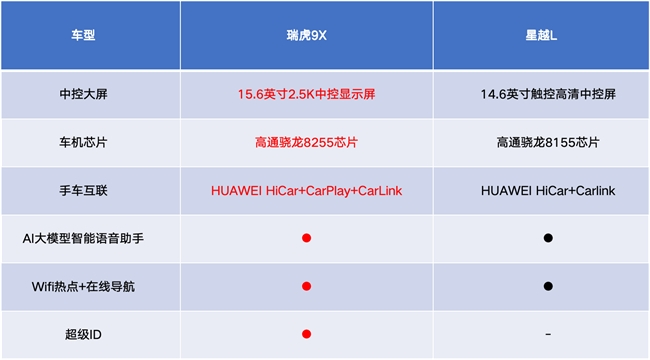 而星越L虽然也搭载了Flyme Auto智能座舱系统,但芯片仅用了高通骁龙8155芯片,屏幕尺寸也仅为14.6英寸,无论是大屏视觉感受,还是车机交互体验的流畅度,相较瑞虎9X都略逊一筹。